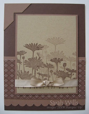 Browns are amongst my most favorite colors to use so I had quite a selection of materials to choose from in my stash – I got out my Upsy Daisy stamp set, assortment of brown Cardstocks and Designer Series Papers, my trusty Punches and beautiful Tafetta Ribbon, and this is what I came up with…