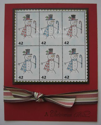 Now for the faux fun part – there is a wonderful tutorial for this technique that you can find here: http://www.splitcoaststampers.com/resources/tutorials/faux_postage/ where you will also be able to download (for free!) the faux postage sheet that you print out onto your white cardstock. You need to choose a small stamp for your ‘postage stamps’ – I used the cute little snowman from the Wishing you Cheer set and stamped him onto my Whisper White cardstock using Black Stazon ink – I colored in the images using Watercolor Wonder Crayons and my Blender Pen. I used a Dauber and Baha Breeze ink to make the ‘sky’ around him. You then cut around the postage stamps using some decorative edge scissors – I used the Fiskars Stamp Paper Edgers. I then attached this to a piece of Old Olive cardstock and then using Dimensionals, onto a base of Chocolate Chip cardstock that I adhered to the card base.
