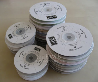 Check out these stacks of gorgeous Stampin’ Up! Ribbons…below are 19 colors of 1/4″ Grosgrain and 9 colors of the beautiful Taffeta Ribbons, all available in the Spring Summer Catalog – and the best bit is that you can sample all of these ribbons at a very low cost by taking part in one of my Ribbon Shares that I am currently running…read on for details :-)