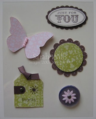 Just for You tag – uses the Scallop Oval Punch along with a stamp from the co-ordinating Oval All set, both of which you can find in the Occasions Mini Catalog on pg 8 – I also used the Large Oval Punch to punch out the sentiment which is stamped with Chocolate Chip Ink onto Very Vanilla cardstock, so that I could layer it using Dimensionals onto the Chocolate Chip Scallop Oval base.
