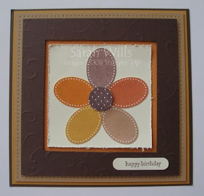 The stamps I used are the oval and circle stamps from the brand new Pumpkin Patch set that is in the upcoming Holiday Mini Catalog – I love to ‘think outside the box’ and come up with different ways to use stamps in a given set to increase their versatility and so decided to use them to make the flower in the card below…